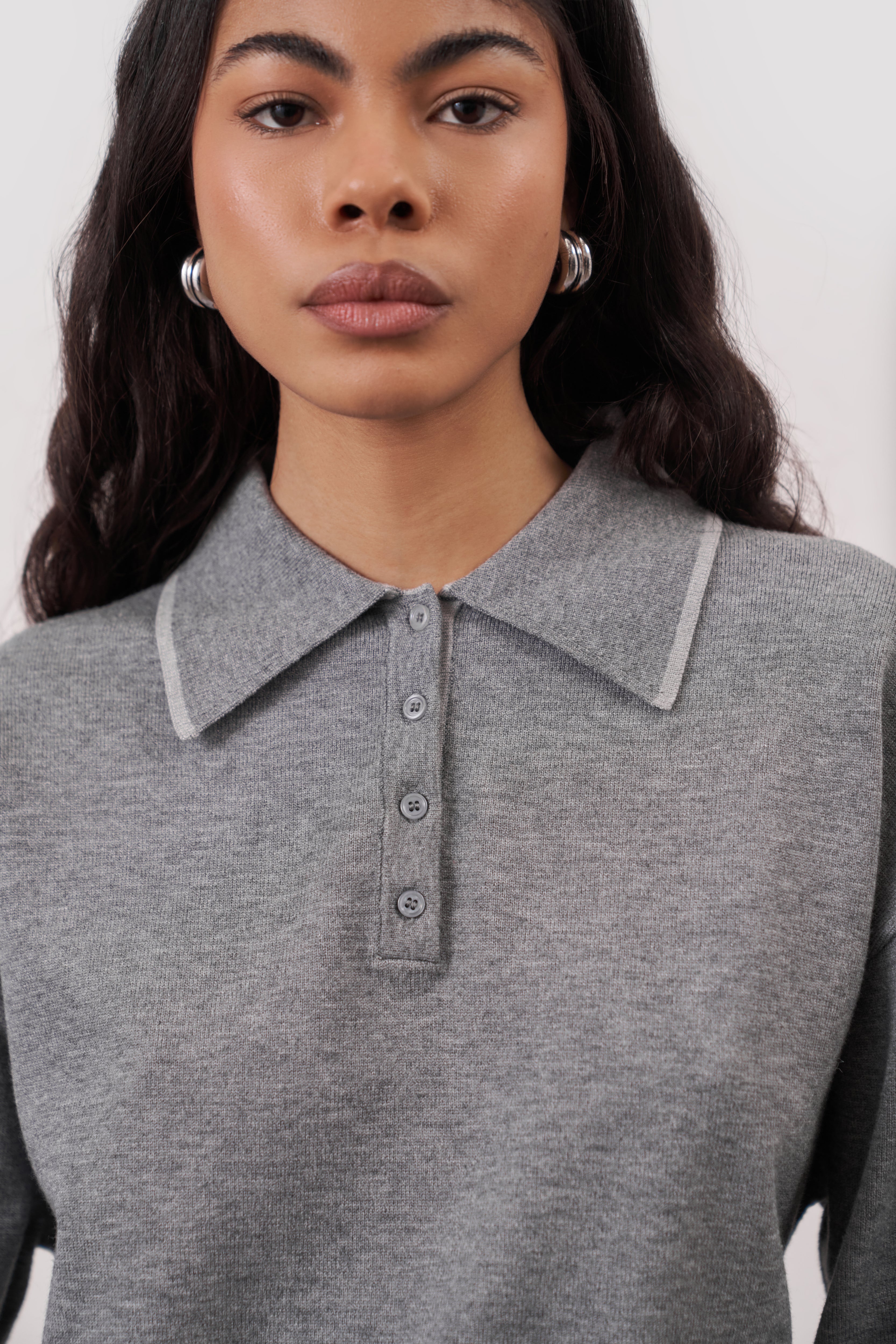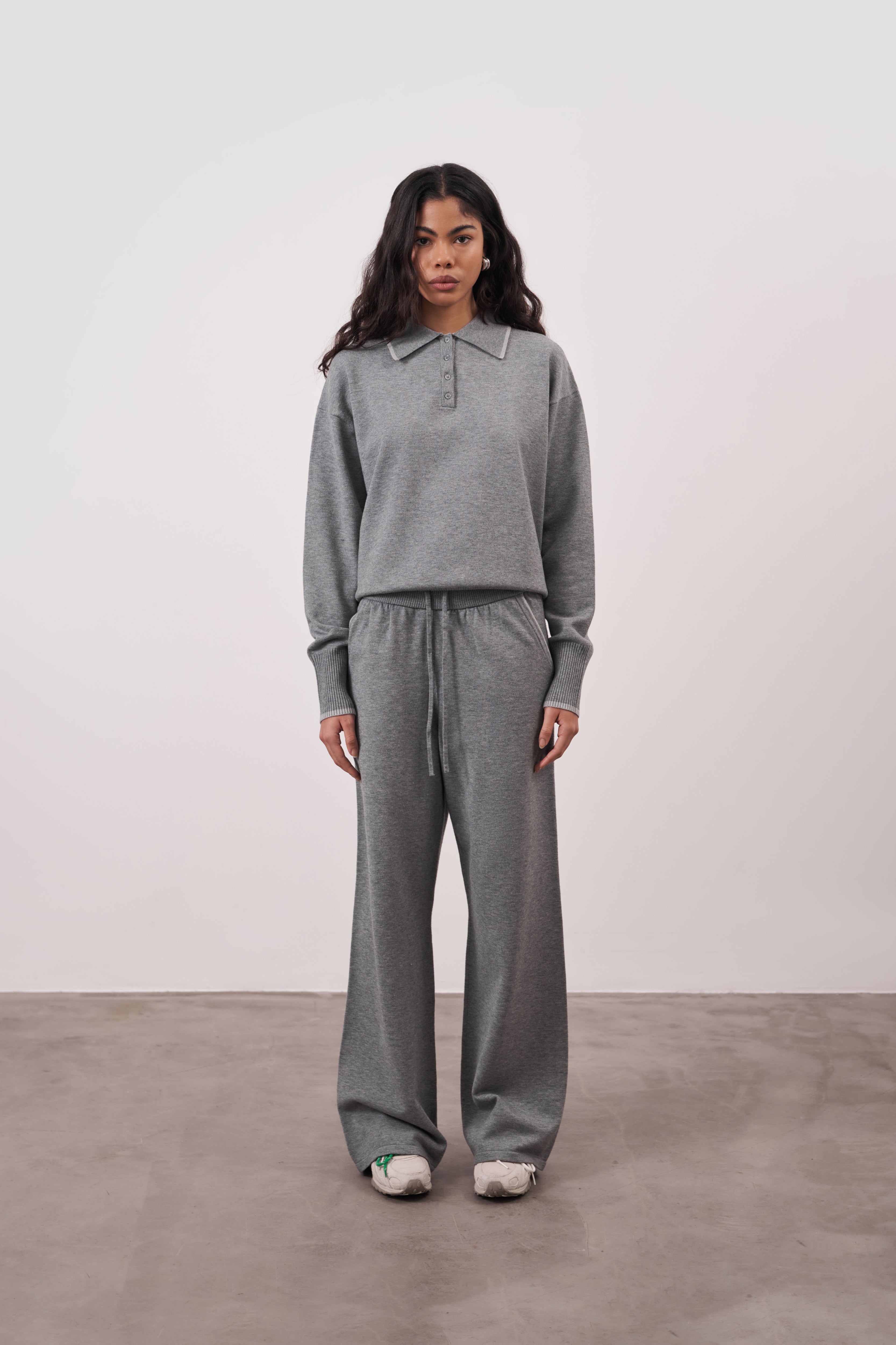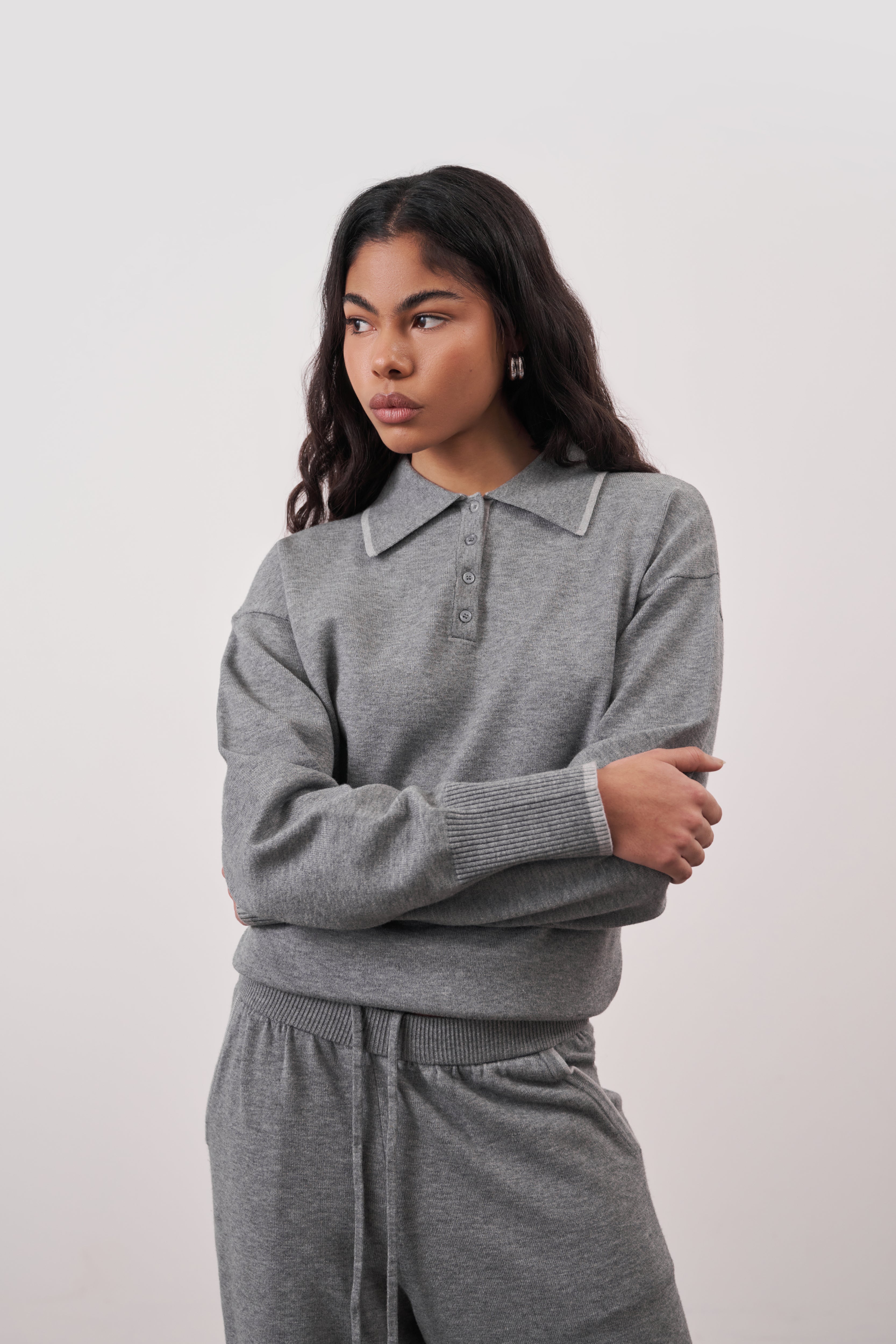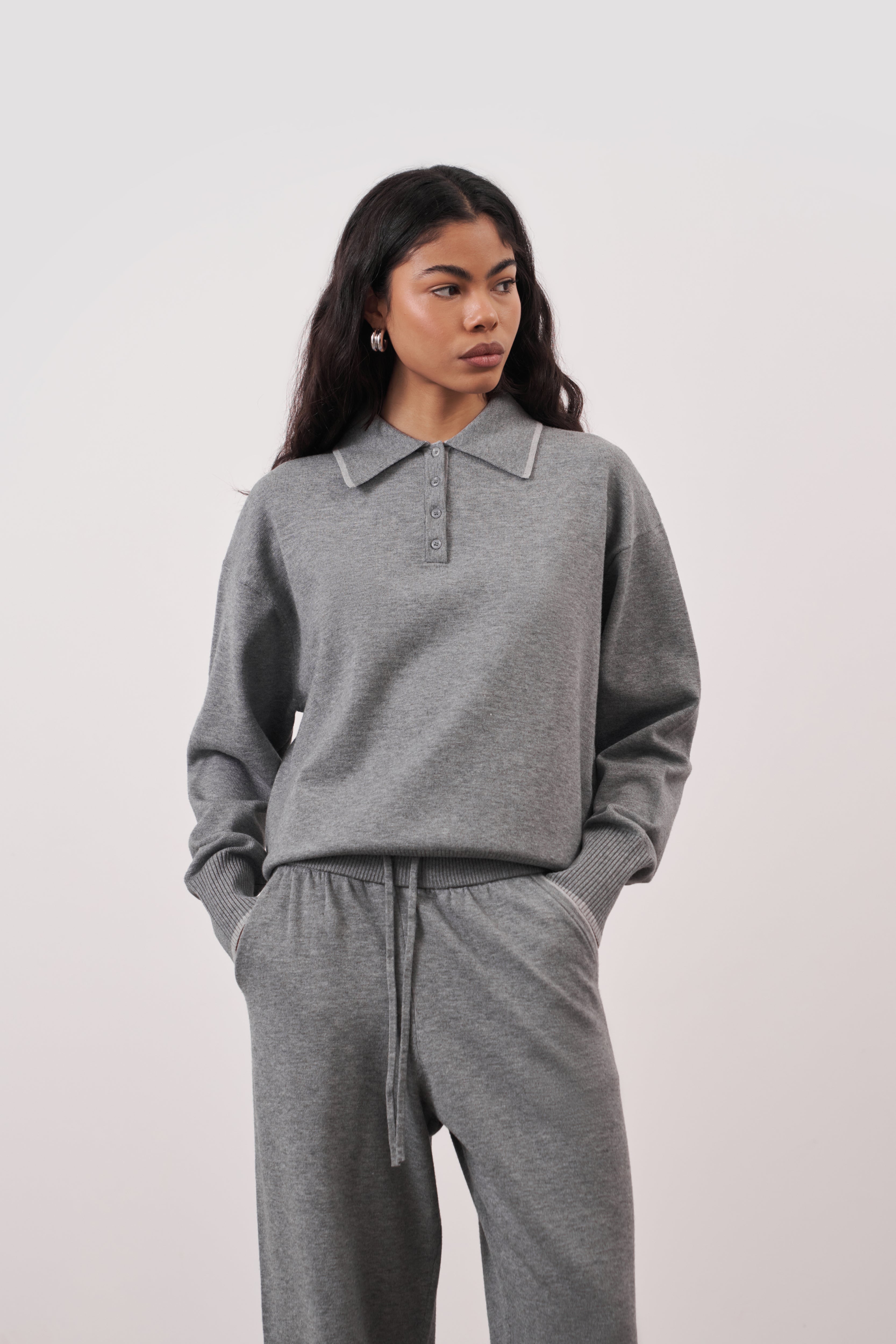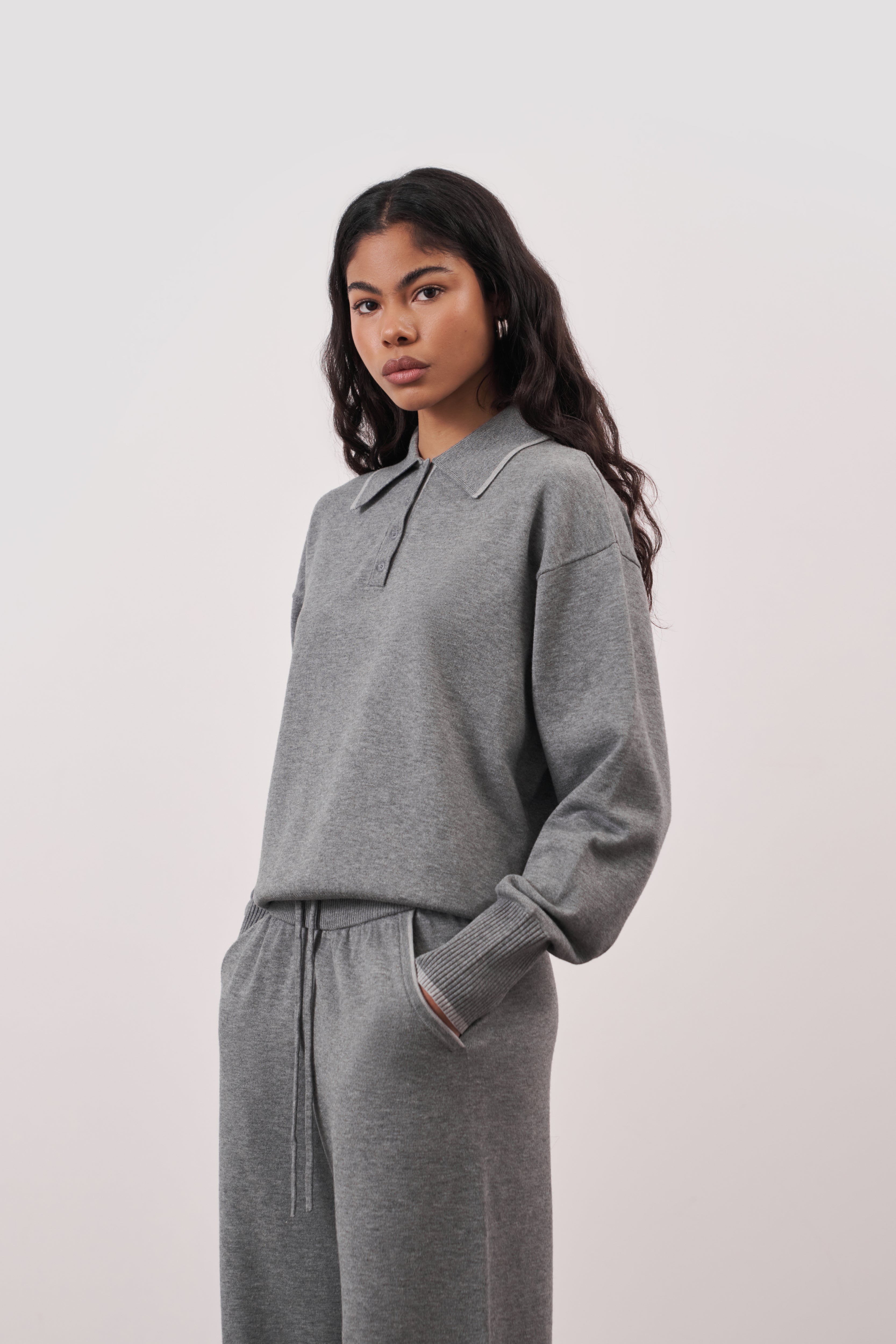 Crafted from a soft premium knit, it features a clean collared neckline and minimal button detailing, designed to pair seamlessly with the On The Go Knit Joggers for all-day comfort.